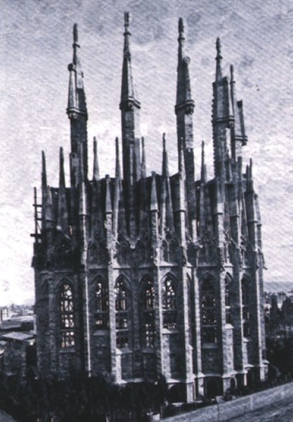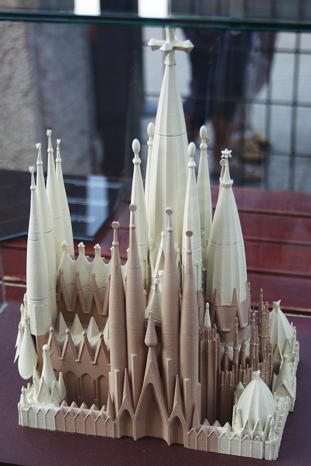 Malheureusement, il ne verra jamais son œuvre achevée, puisqu’il décède d’un accident de tramway en 1926. Il manque alors à l’imposant édifice toutes les parties représentées en marron sur la maquette ci-dessous.