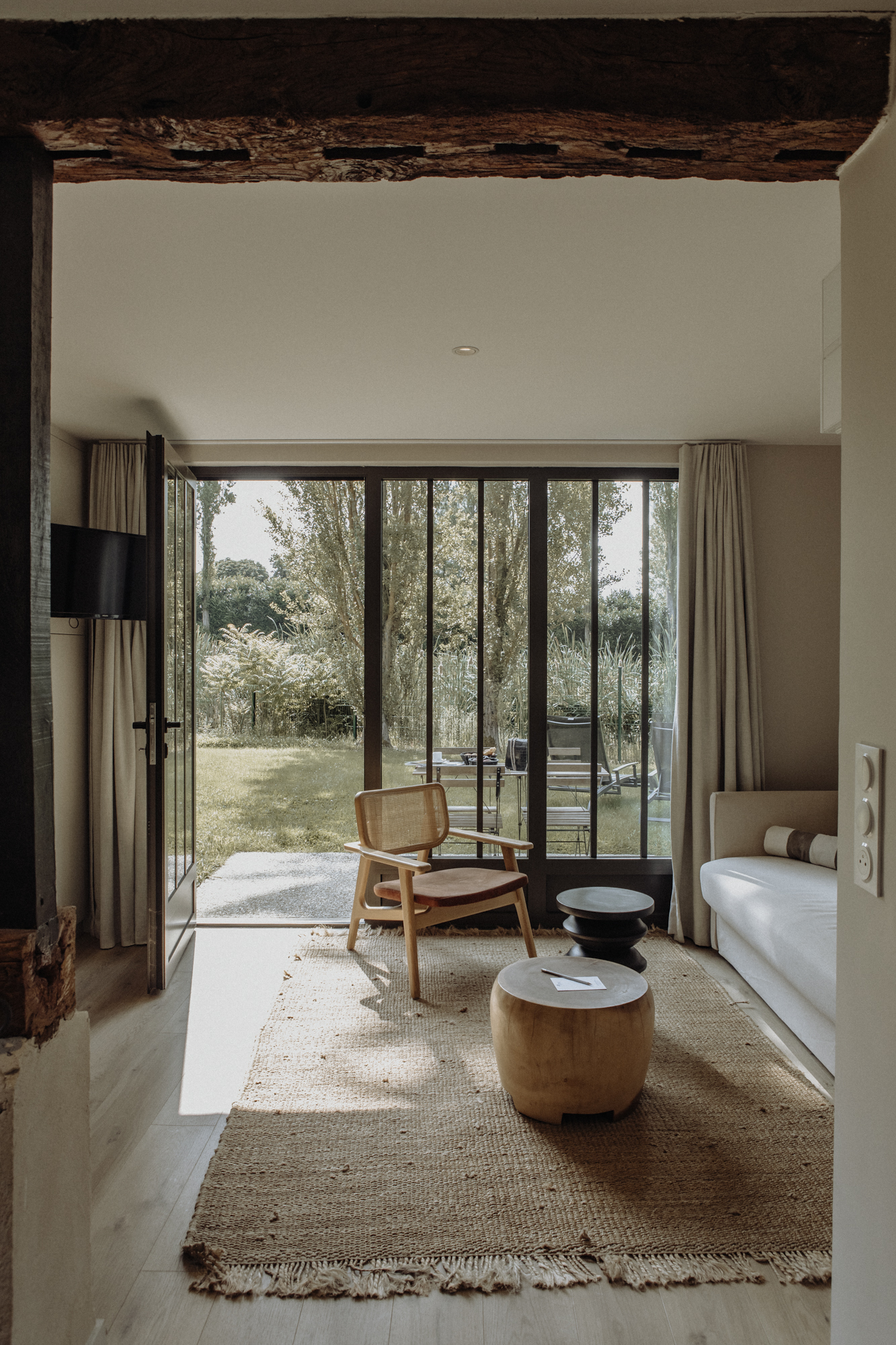 L’hôtel se compose de 27 chambres et suites, réparties dans 9 cottages et un manoir classé aux monuments historiques. Les cottages, adorables petites maisons typiquement normandes, font entre 34 et 42 m². Dans l’une des chambres « Supérieur Double », l’ambiance est au cocooning, le blanc et le beige y rencontrent le bois dans un style rustique chic. Dans une autre, c’est un camaïeu de gris et une décoration plus contemporaine qui vous attend… Toutes mélangent les styles et les matières avec raffinement.