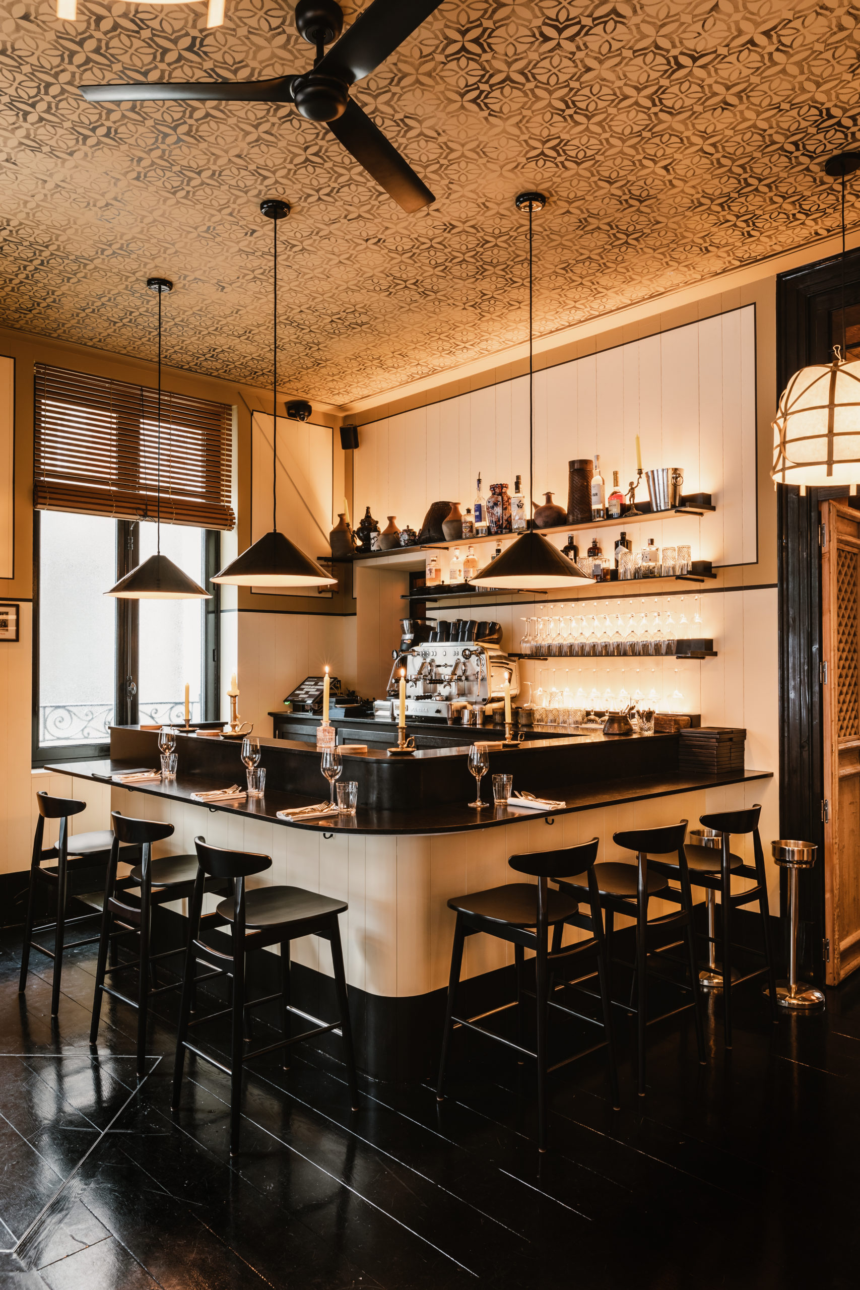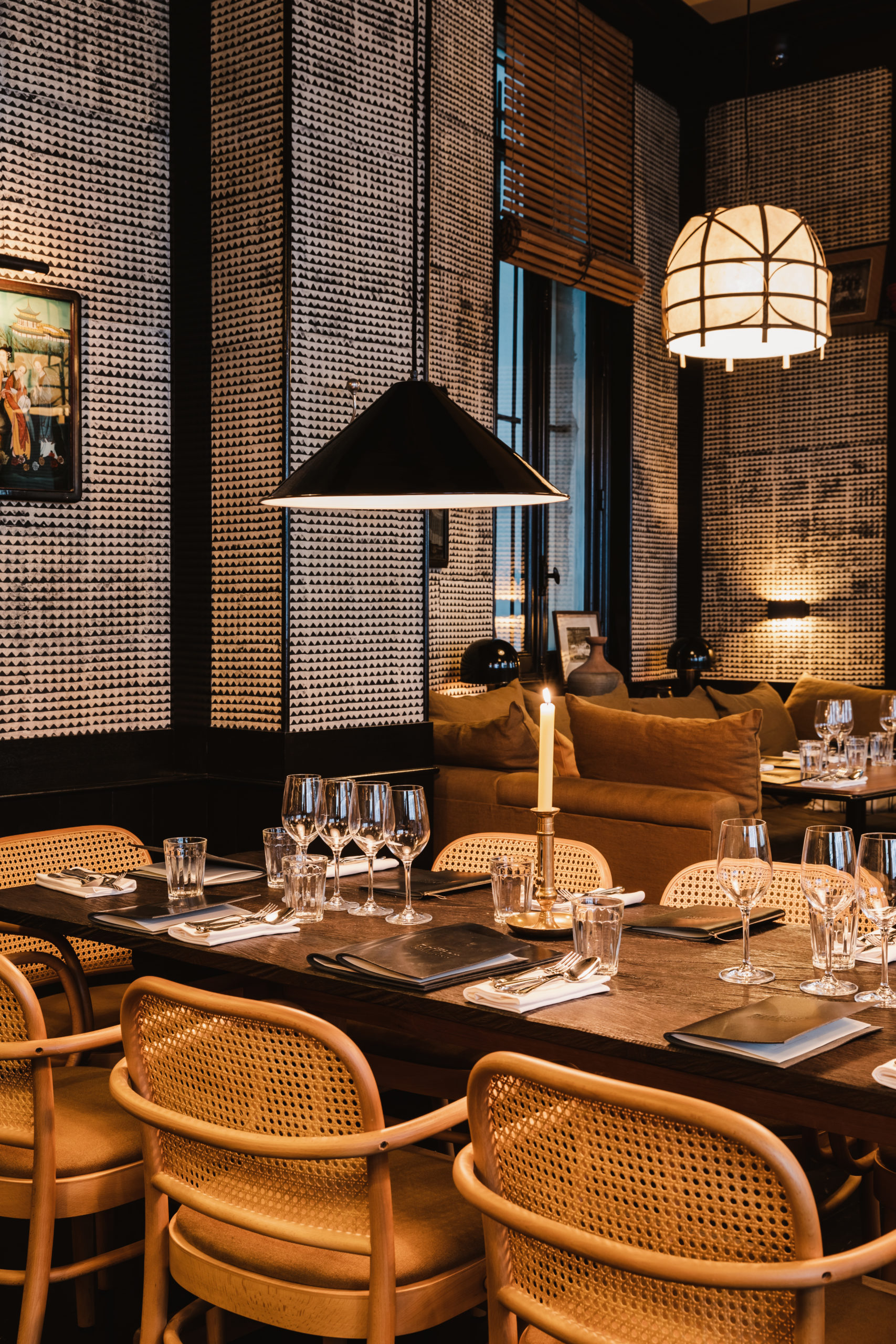 son temps : la salle principale, lumineuse et sobre à la fois, est idéale pour prendre un verre. Un peu plus au fond, le deuxième espace dévoile une grande table pour dîner entre amis. Le long du mur, des grandes banquettes englobantes invitent à lâcher prise. Le restaurant dispose également d’un salon privatisable derrière le comptoir pouvant accueillir une vingtaine de couverts. Ce salon se distingue par son élégant papier peint noir et or, sa moquette et son plafond tressé.