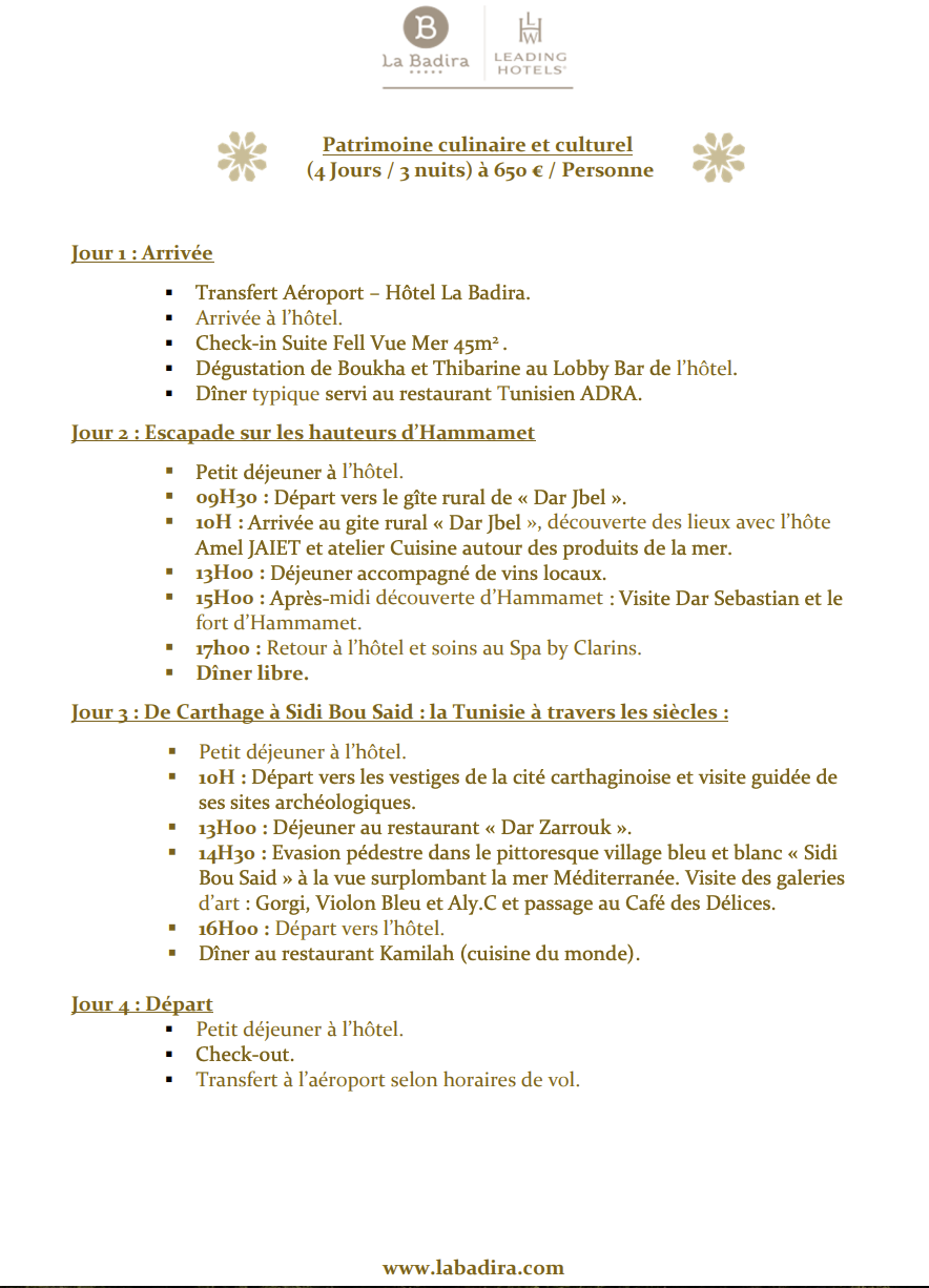 Le séjour de trois nuits organisé par La Badira s’articule autour de moments gourmands. Parmi eux, un dîner typique servi dans le restaurant de l’hôtel, l’Adra. Voyage en Tunisie oblige, des dégustations de Boukha (eau-de-vie de figues ) et de Thibarine (liqueur de dattes) sont également prévues. Pour la relaxation, l’établissement 4* vous prévoit un passage au sein de son Spa by Clarins des Mille et Une Nuits.
